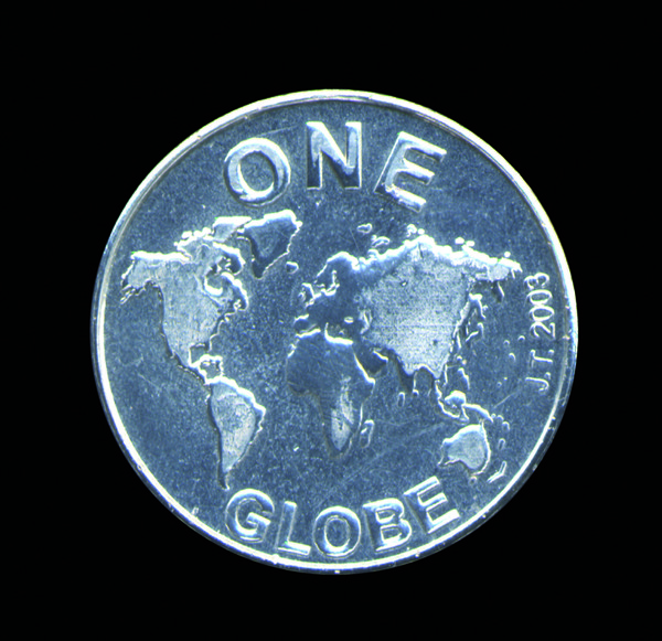 One globe is the futuristic vision of a world currency. Viewers can coinage the currency themselves with a hammer.